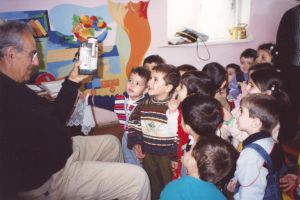 My father showing Armenian children in Stepanakert some of the videos he was filming. (October, 2000)